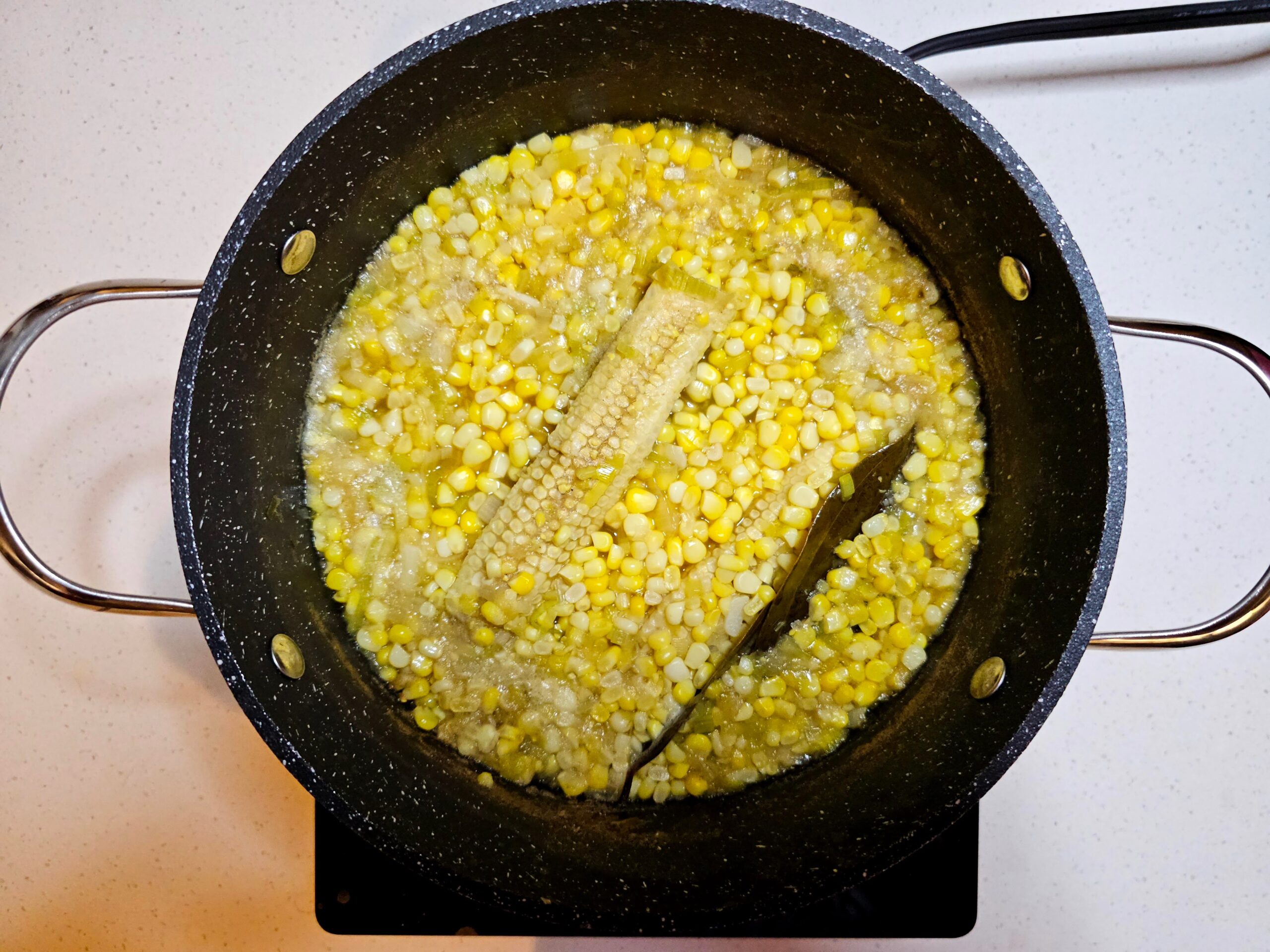 Turn off the sauté function and set aside about ⅓ cup of the corn kernels—these will be added at the end for a bit of texture. To the pot, add the remaining kernels, the reserved corn cobs, bay leaves, tarragon stems, and chicken broth. Add enough broth to just cover the corn kernels; this ensures the flavors are concentrated and the soup doesn’t become too thin. Stir everything together to combine the ingredients evenly.
