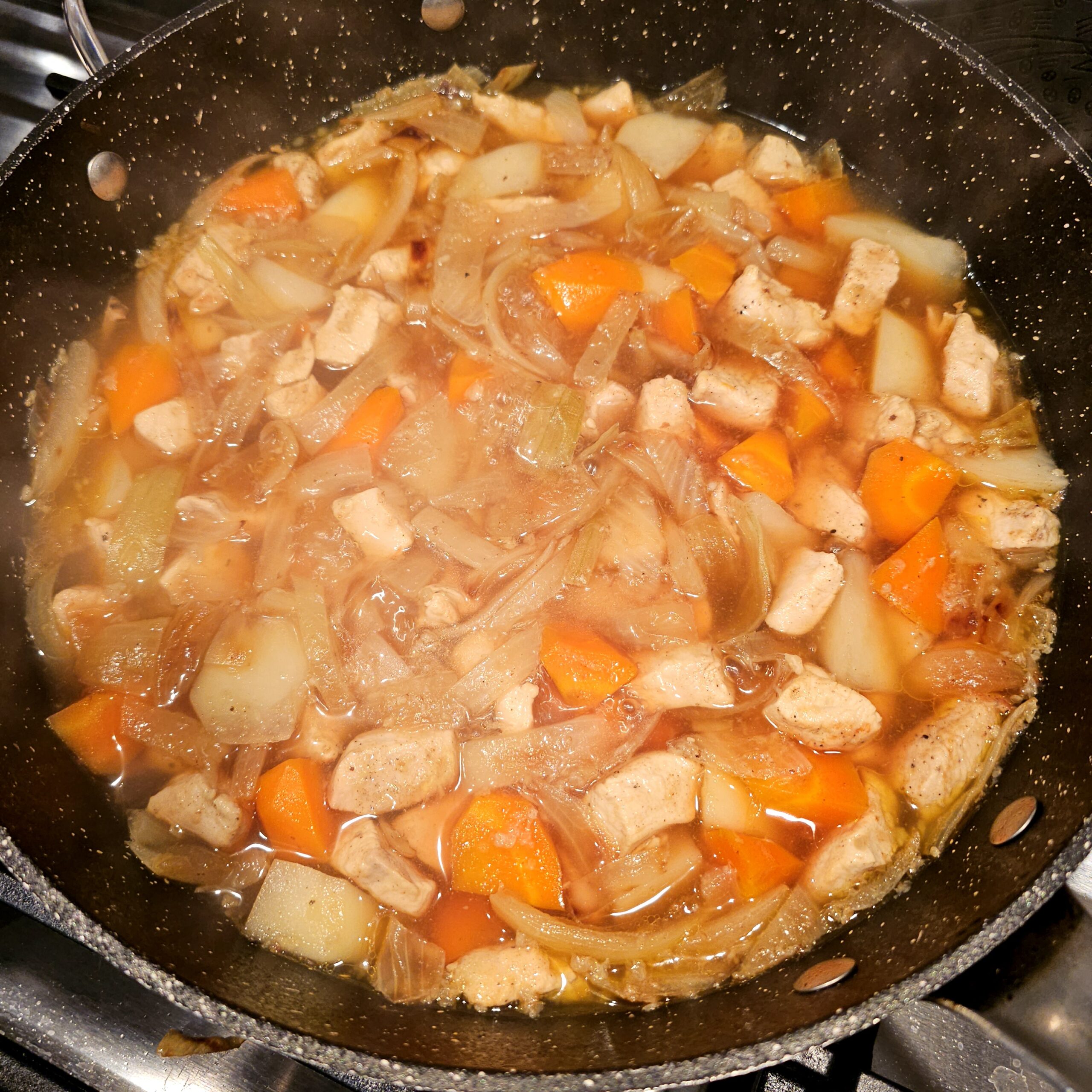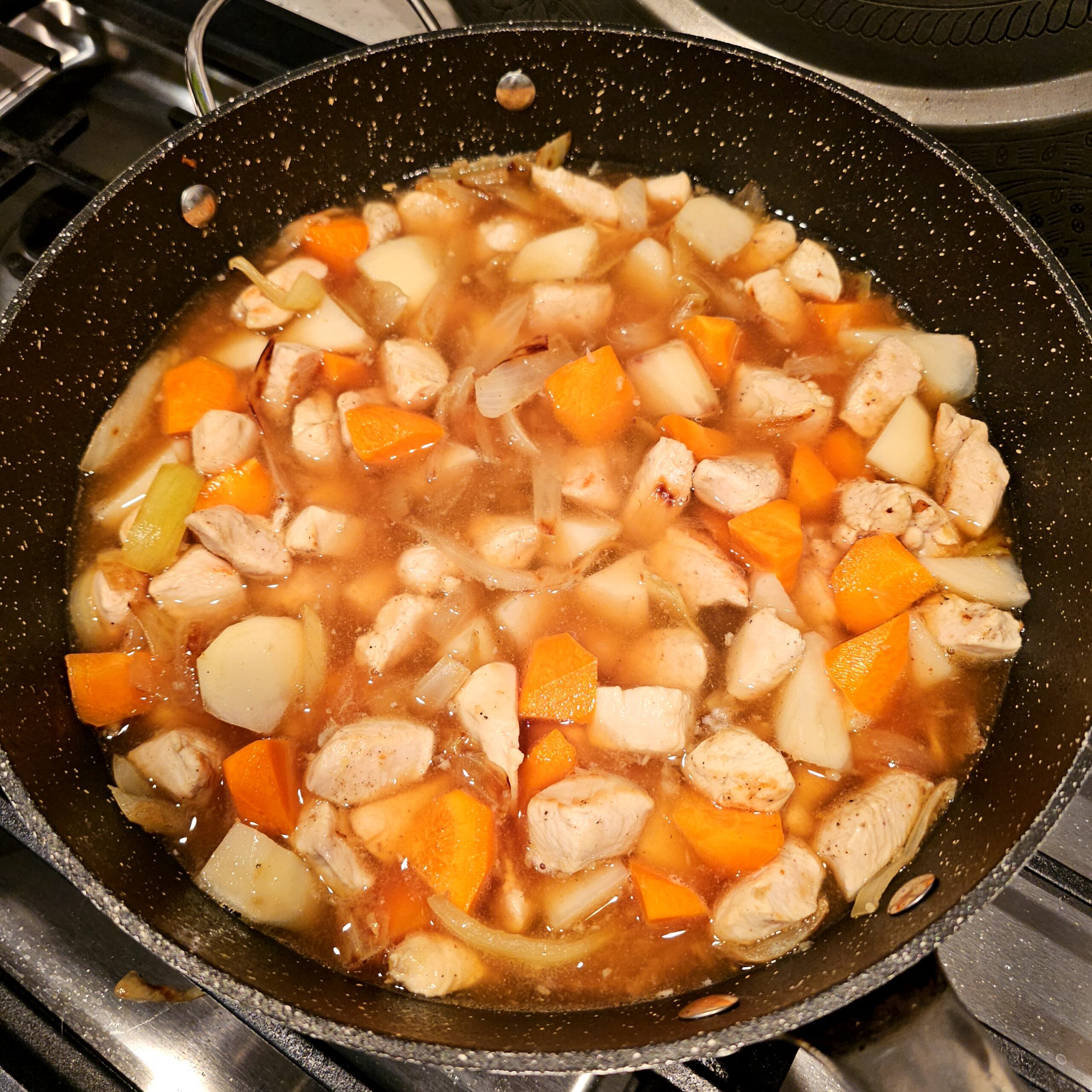 Pour in the chicken broth, honey, and soy sauce, stirring everything together. Add the carrots and potatoes, ensuring they are just covered by the liquid. Adjust with more broth or water if necessary.