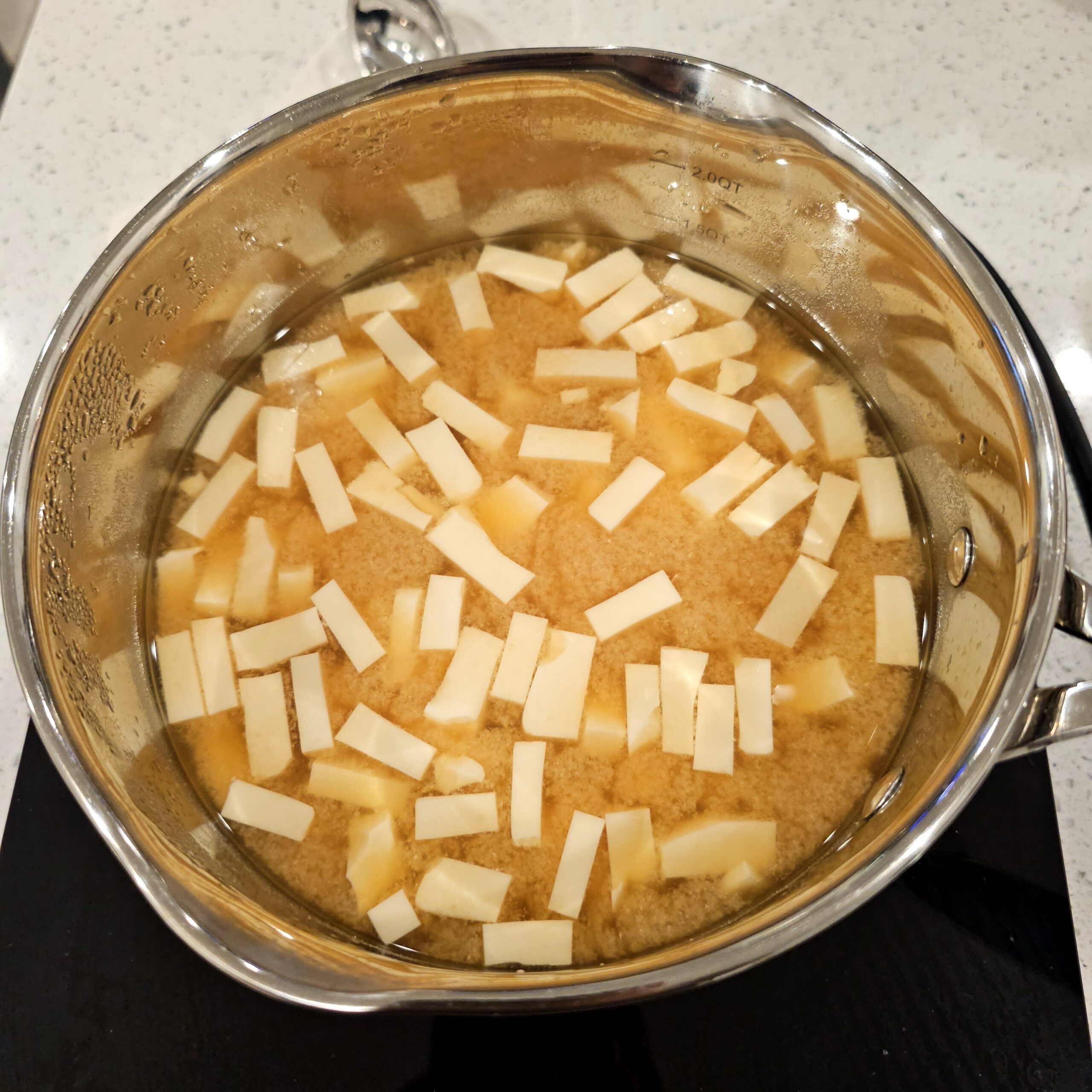 Start by making your dashi, as this will be the foundation of your miso soup. If you’re using a dashi packet or powder, follow the instructions on the packaging to dissolve it in 4 cups of water and bring it to a gentle boil over medium heat.