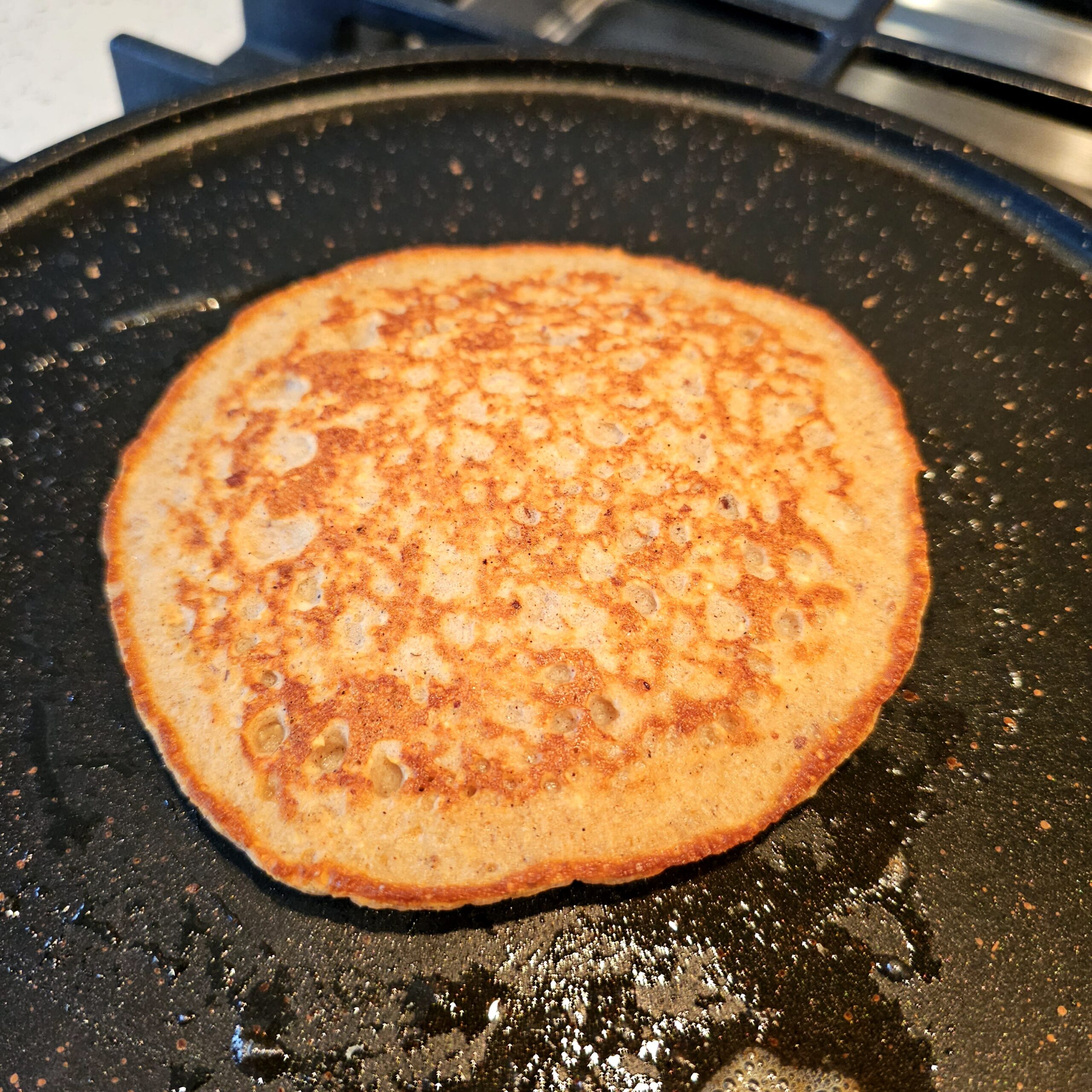 Using a 1/4-cup measuring cup, scoop the batter and pour it into the center of the skillet. Spread it slightly if needed to form an even circle. Cook the pancake for 1 1/2 minutes, or until the edges start to set and bubbles form on the surface. Flip the pancake gently using a spatula and cook for another minute on the other side until golden brown. Adjust the heat as necessary to avoid over-browning.