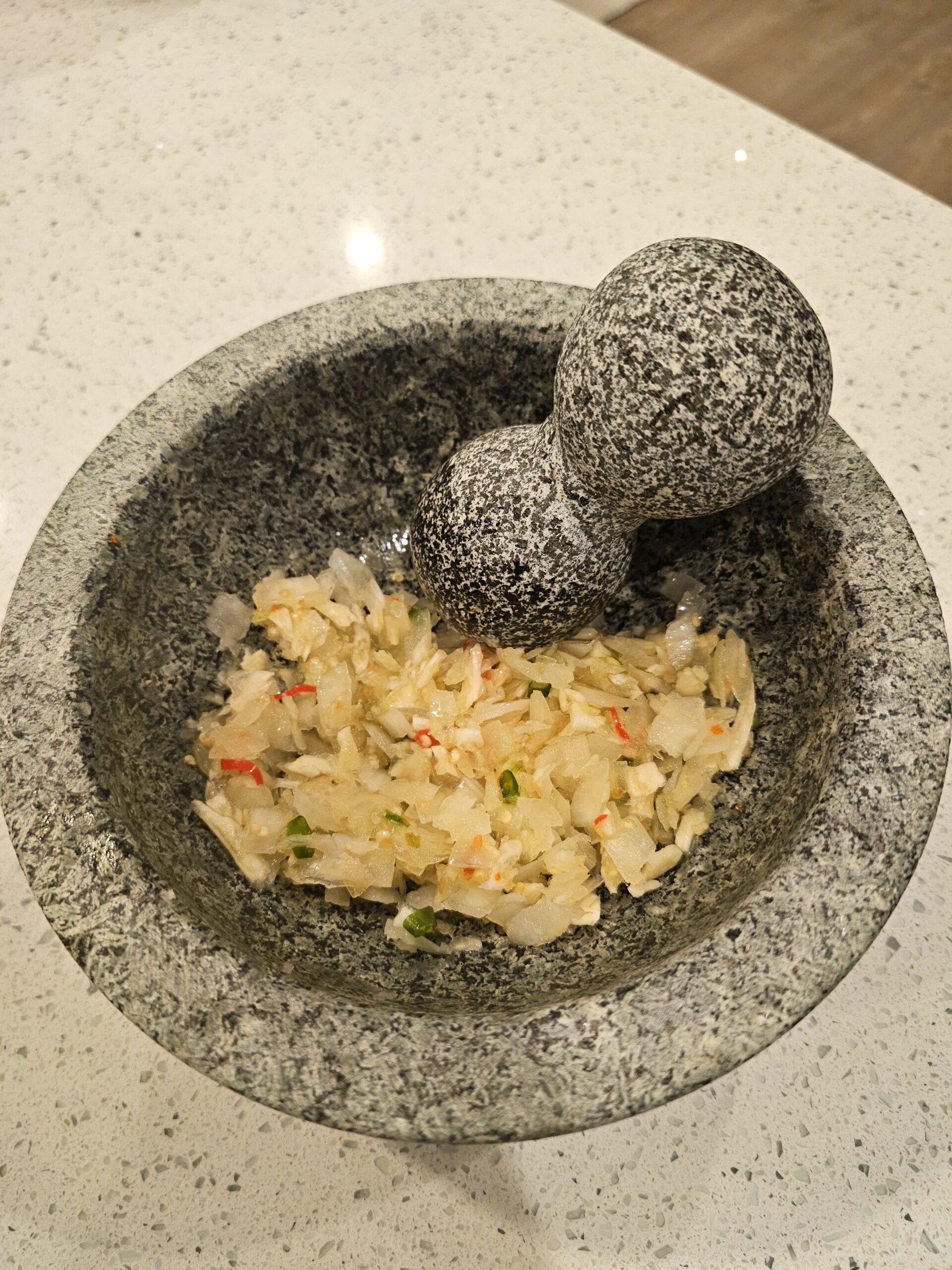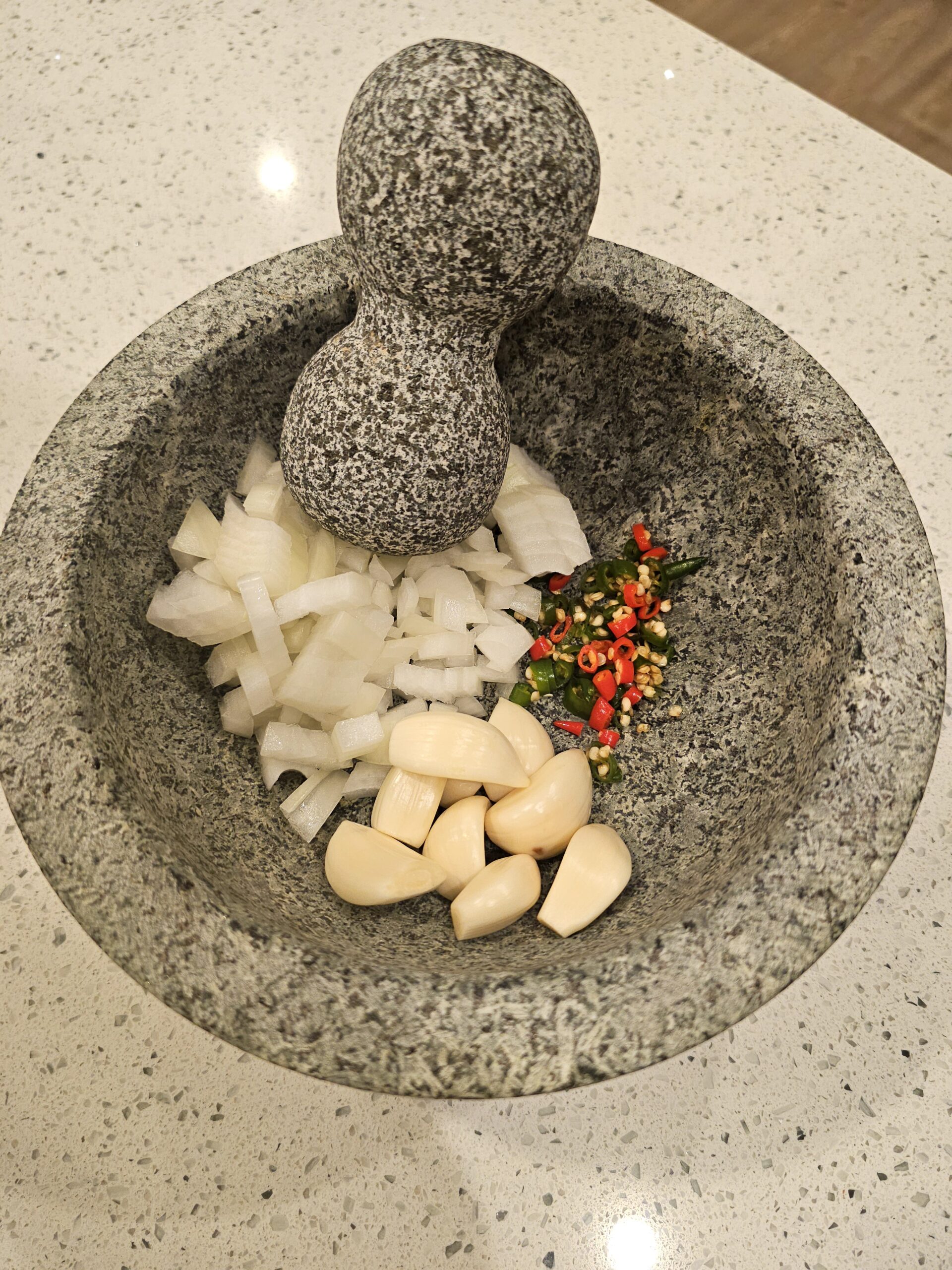 - Using a mortar and pestle, pound together the garlic, thai chilis, and shallot until it is a coarse paste. If you don’t have a mortar and pestle, you can either chop them very finely or use a mini food-processor.8 garlic cloves, 4 thai chilis, 1 large shallot