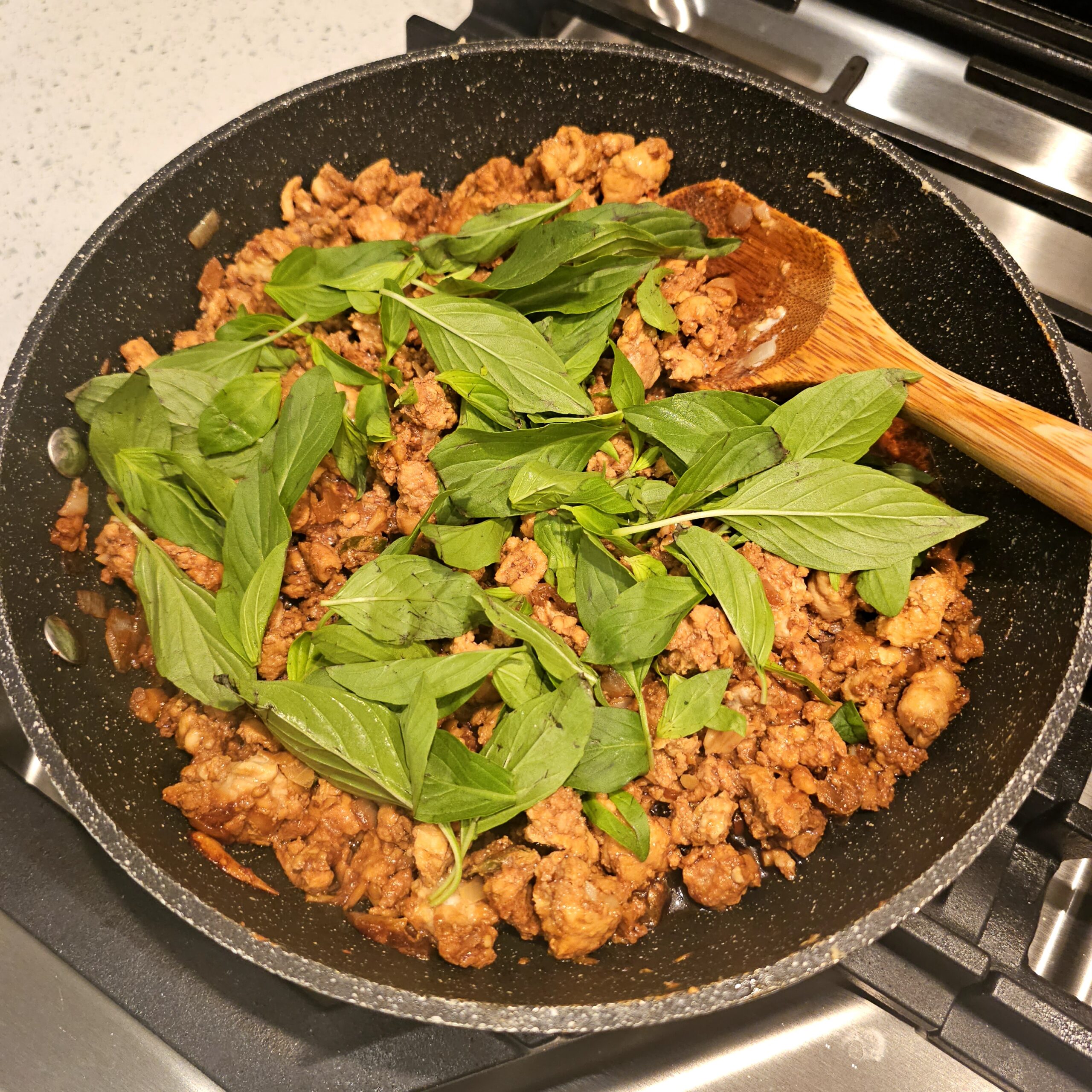 Once the meat is fully cooked and the sauce has thickened, stir in the holy or Thai basil leaves. Remove the skillet from the heat immediately after adding the basil, as you want the residual heat to wilt the leaves without cooking them. This helps preserve their fresh, aromatic flavor.