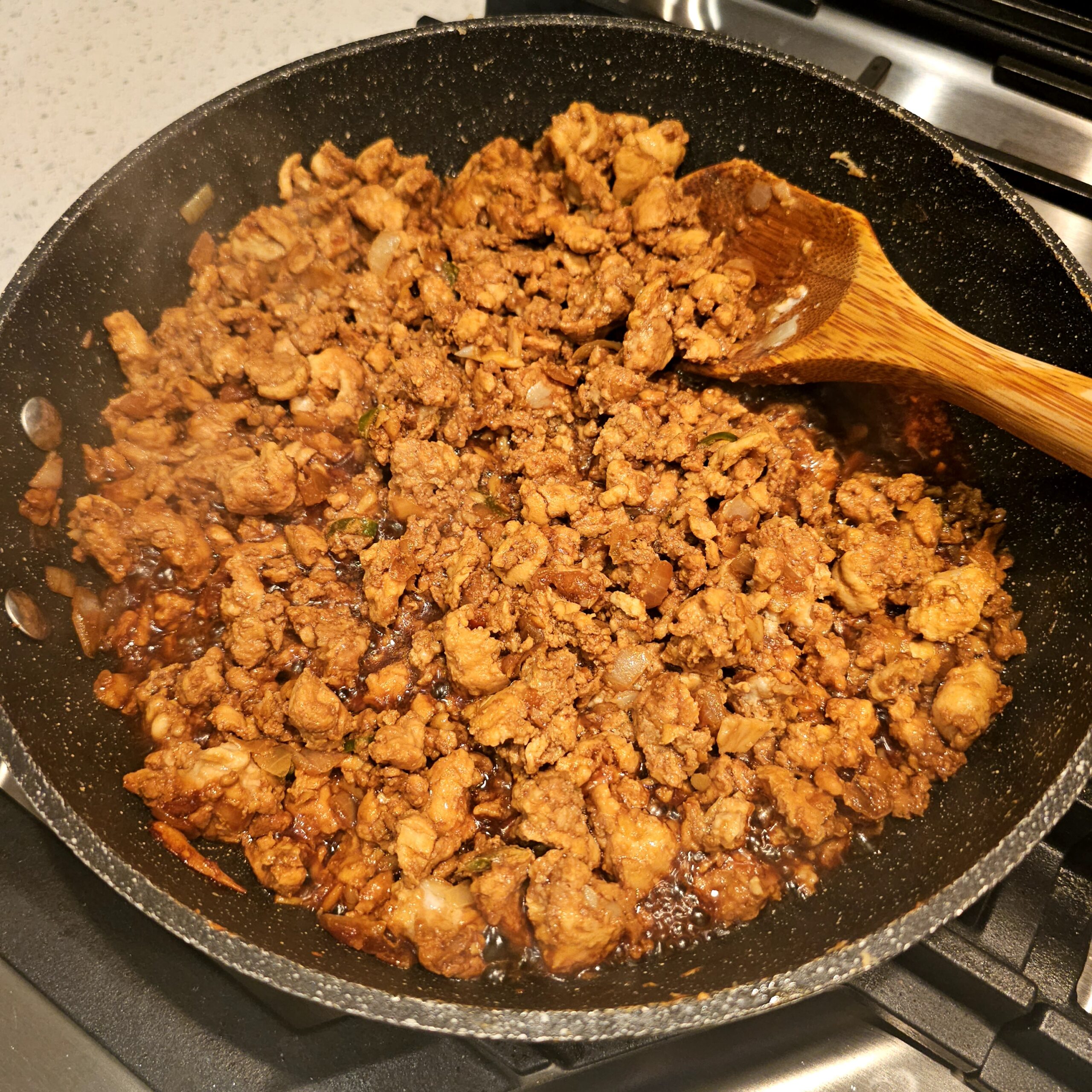 Add the ground chicken or pork to the skillet, breaking it apart with a wooden spoon as it cooks. Stir frequently to ensure even cooking. It’s fine if the meat isn’t fully cooked yet, as it will continue to cook with the sauce. If you’re using finely chopped chicken, cook until the edges start to brown for a more authentic texture.