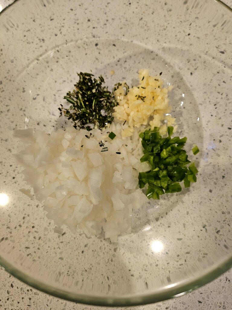 Start by finely dicing the onion and mincing the garlic and jalapeño. You want these ingredients to blend seamlessly into the burgers, so chopping them finely is key. In a medium mixing bowl, combine the onion, jalapeño, garlic, breadcrumbs, egg, mayonnaise, Worcestershire sauce, Dijon mustard, salt, black pepper, and fresh rosemary. Mix everything thoroughly so the seasonings are evenly distributed.