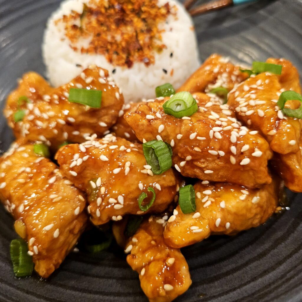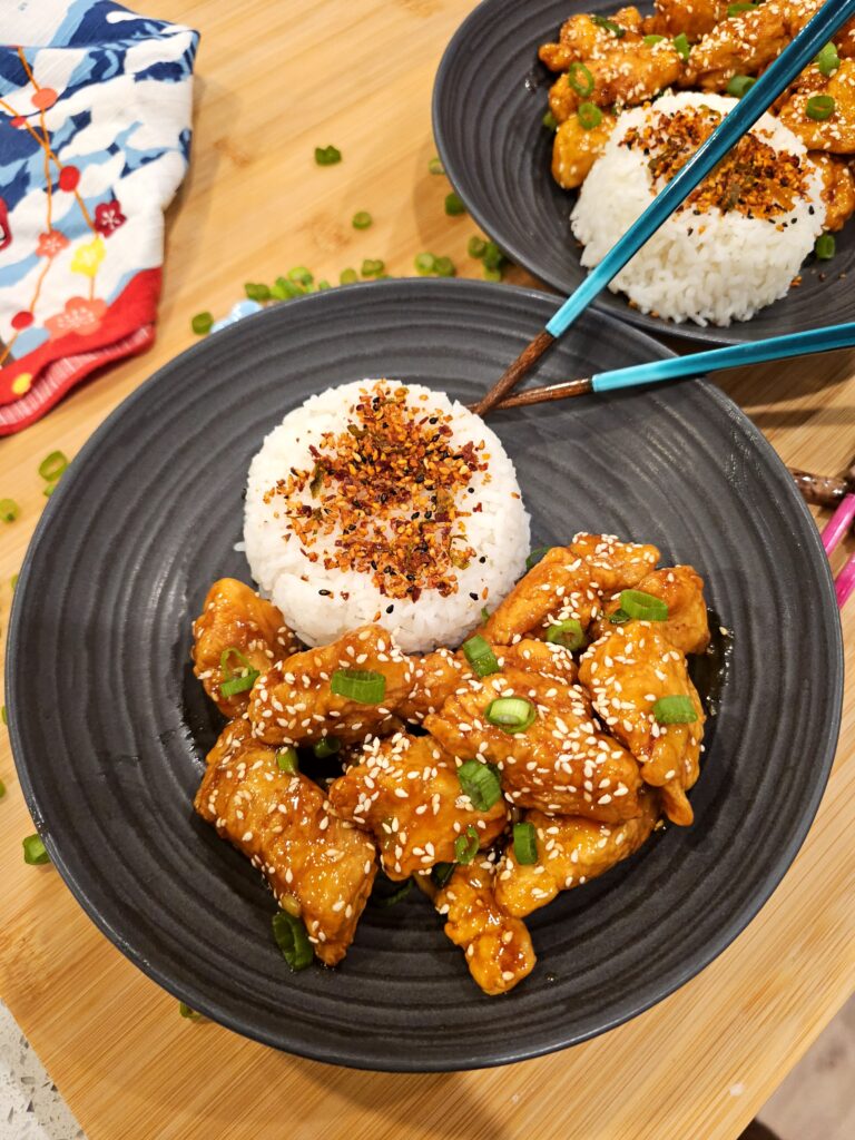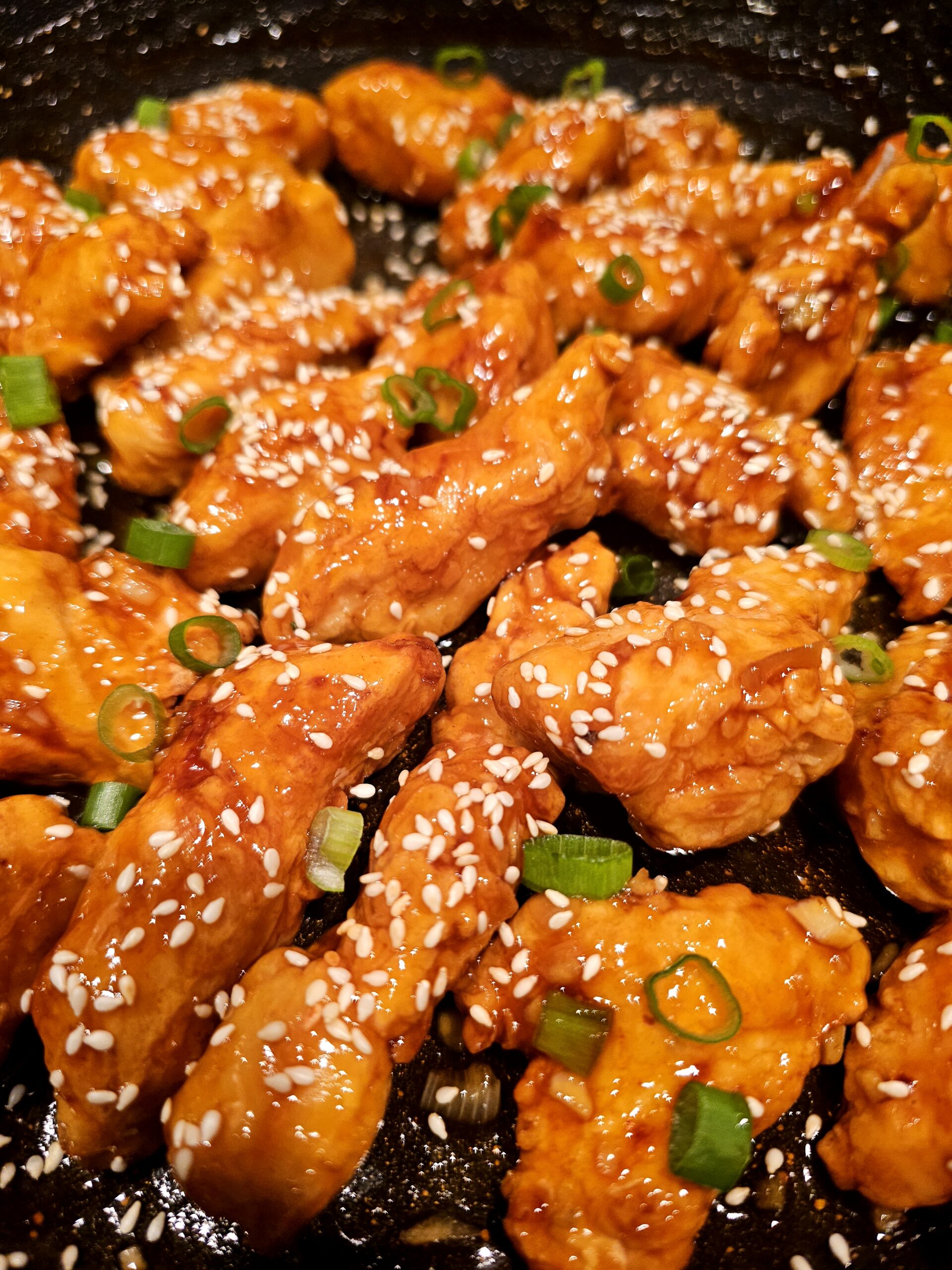 Once the chicken is beautifully coated, remove it from the heat and sprinkle with chopped green onions. Serve it over a bowl of fluffy white rice and enjoy! If you like extra crunch, you can top it with more sesame seeds or even a drizzle of sriracha for an extra kick.