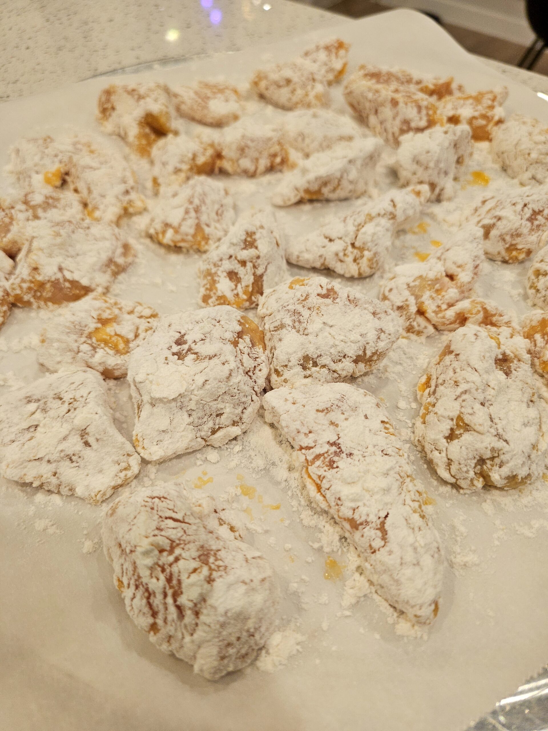 - First, coat the chicken in the cornstarch, shaking off any excess cornstarch. Then dip in the pieces in the beaten egg, ensuring the chicken pieces are entirely coated. Finally, dredge the chicken in the seasoned flour mixture. Place your coated pieces on a wire rack over a baking sheet.