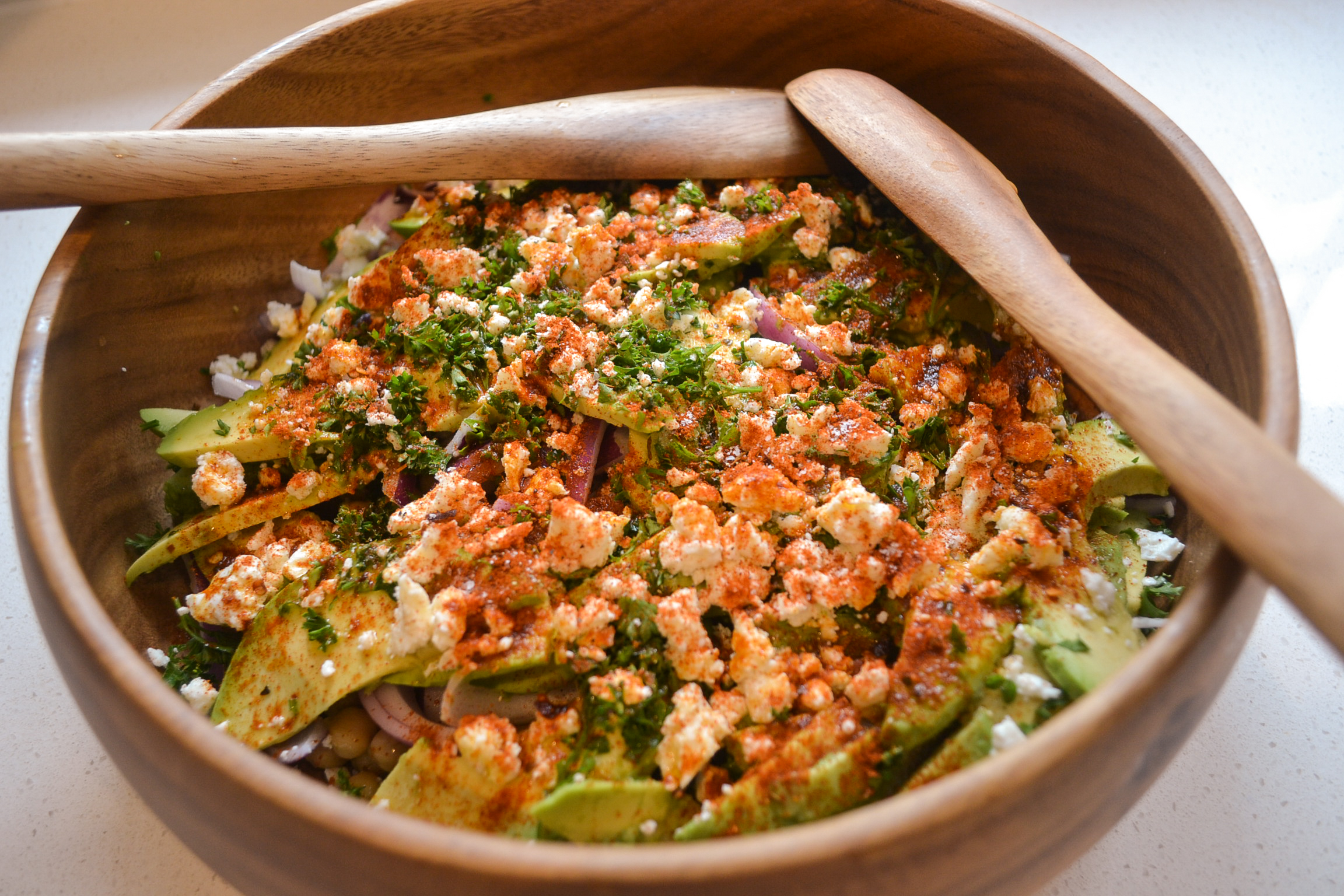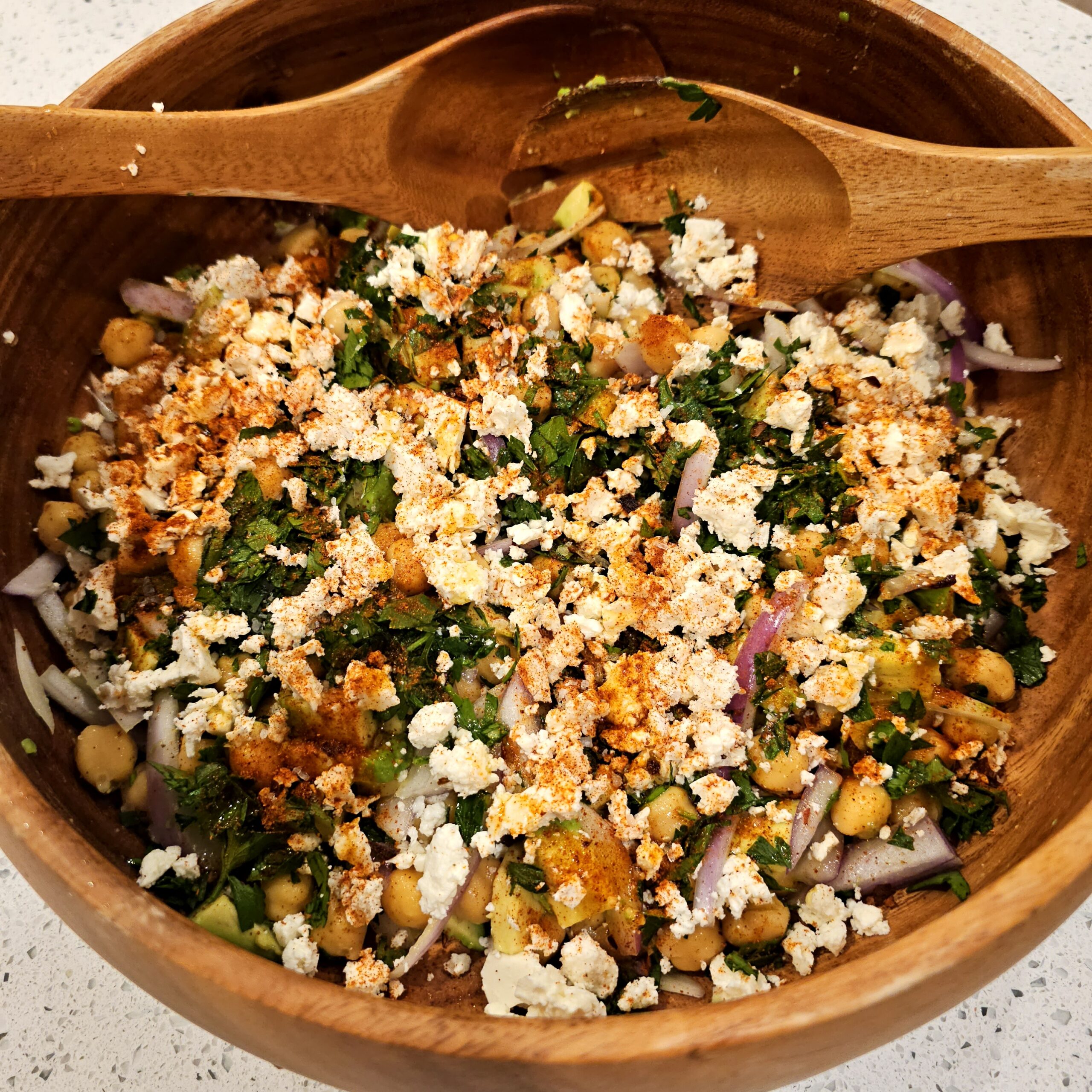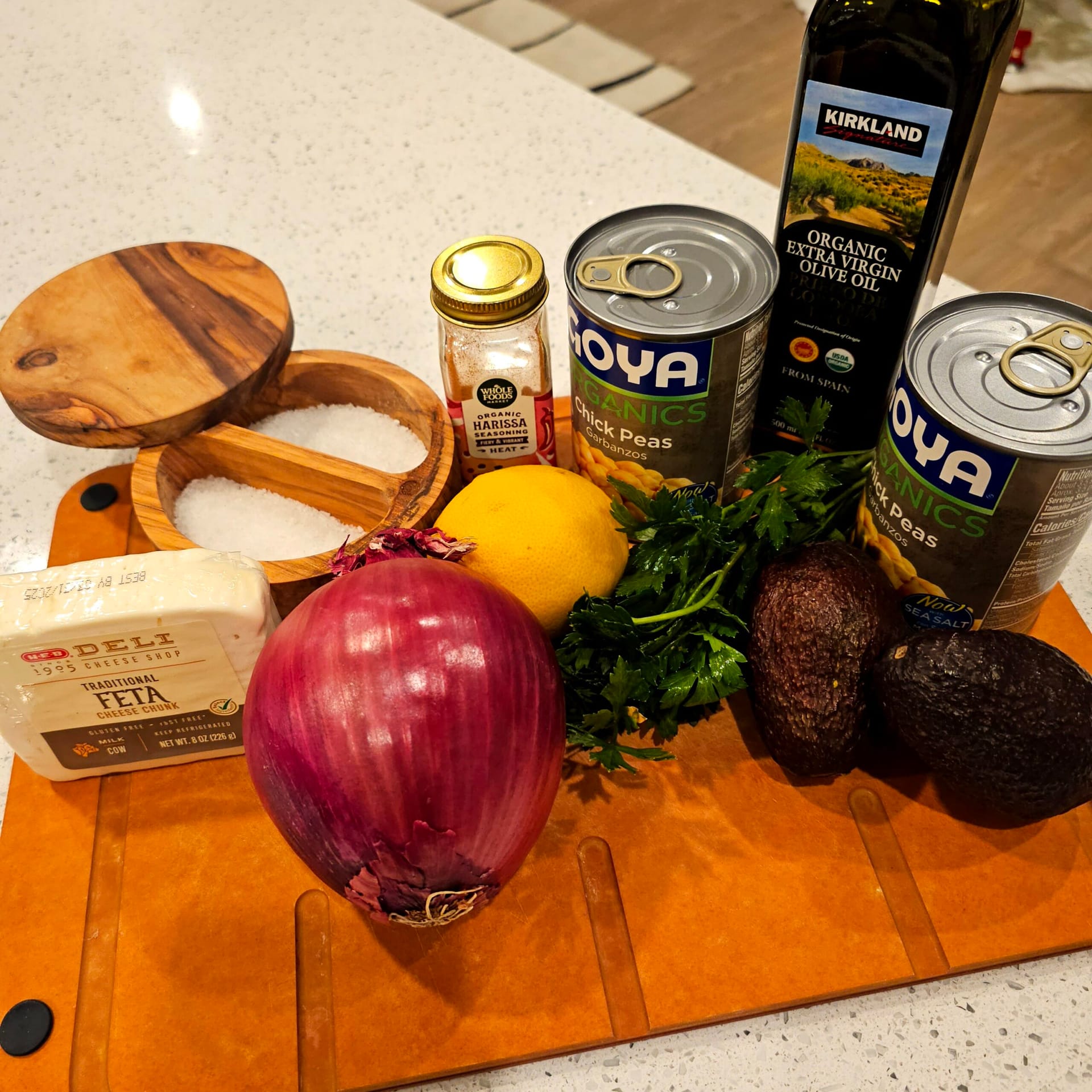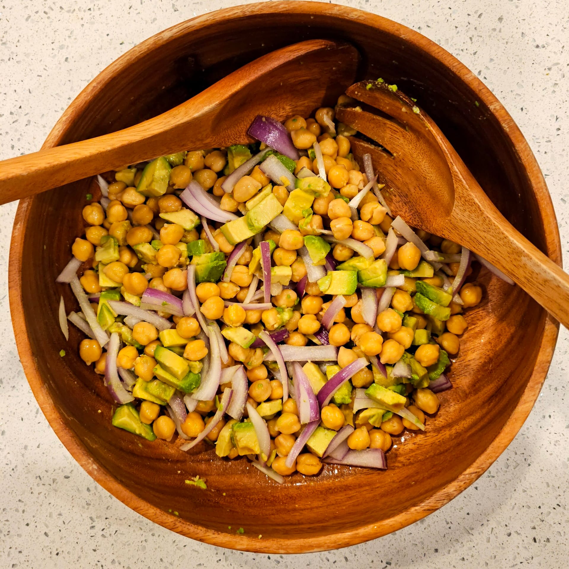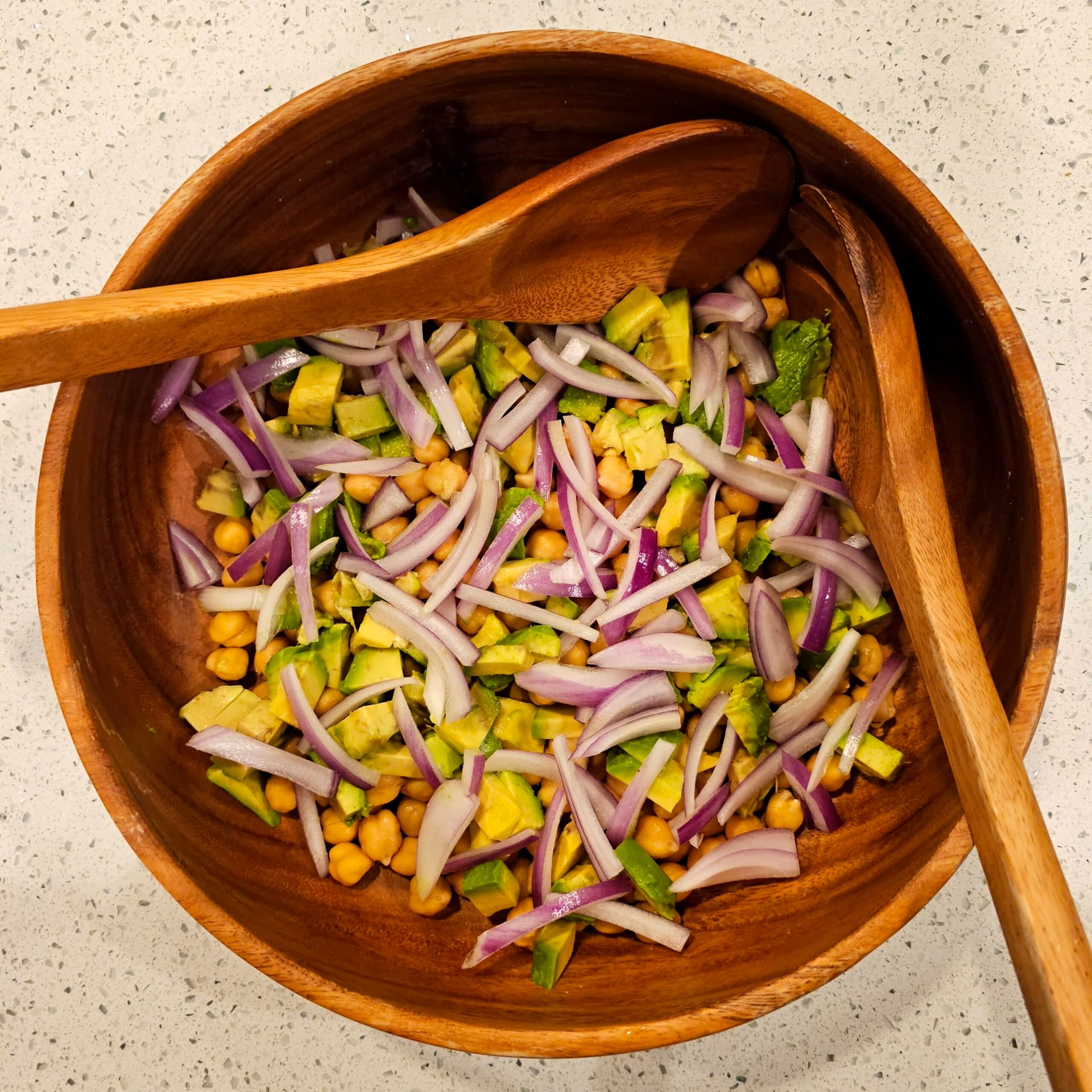 - Combine avocado, chickpeas, and red onion in a large mixing or salad bowl.2 16 oz cans of chickpeas, 1 large avocado, ½ red onion