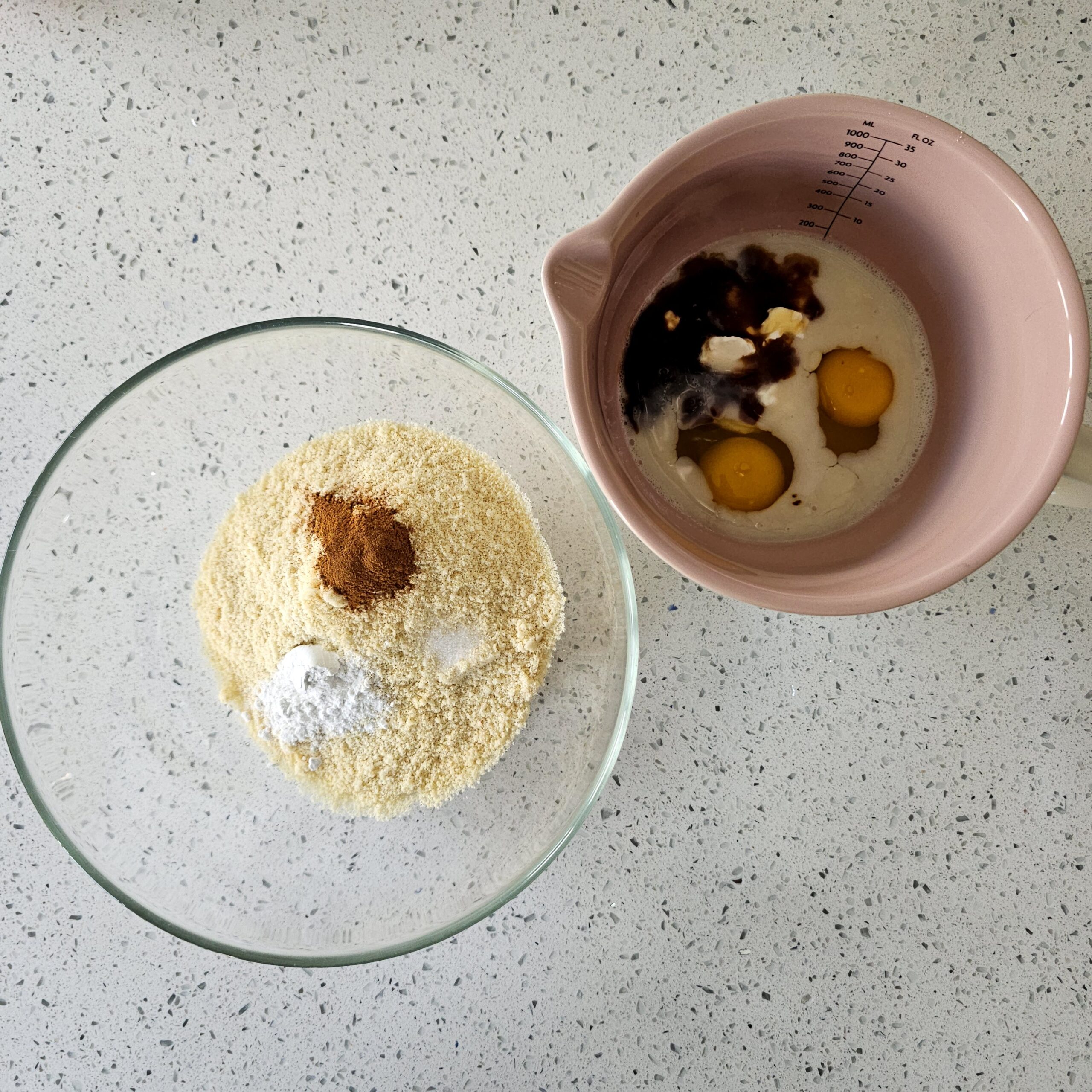- In a medium bowl, whisk together the almond flour, baking powder, cinnamon, and salt.1⅓ cups almond flour, 1 teaspoon baking powder, 1 pinch salt, ½ teaspoon cinnamon
