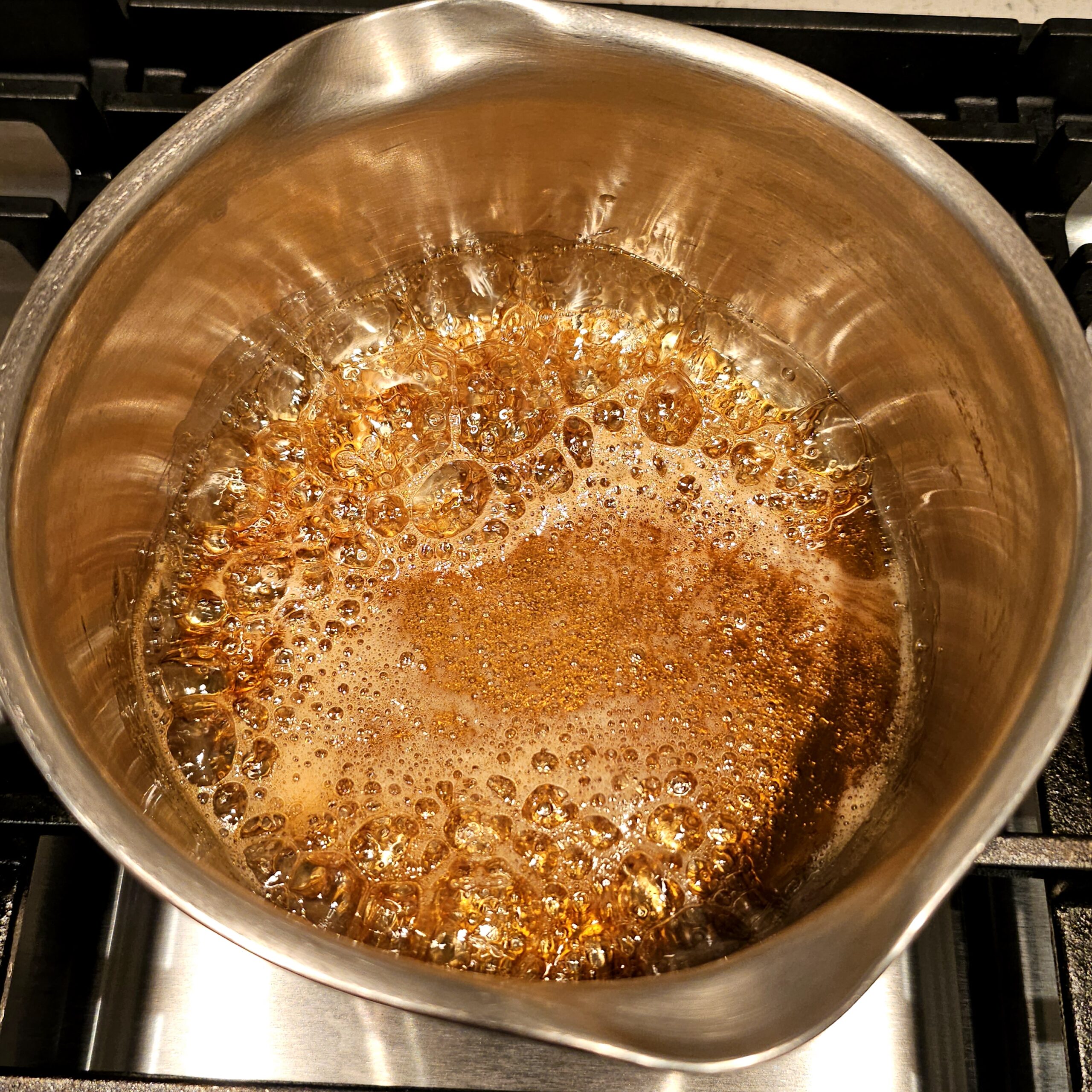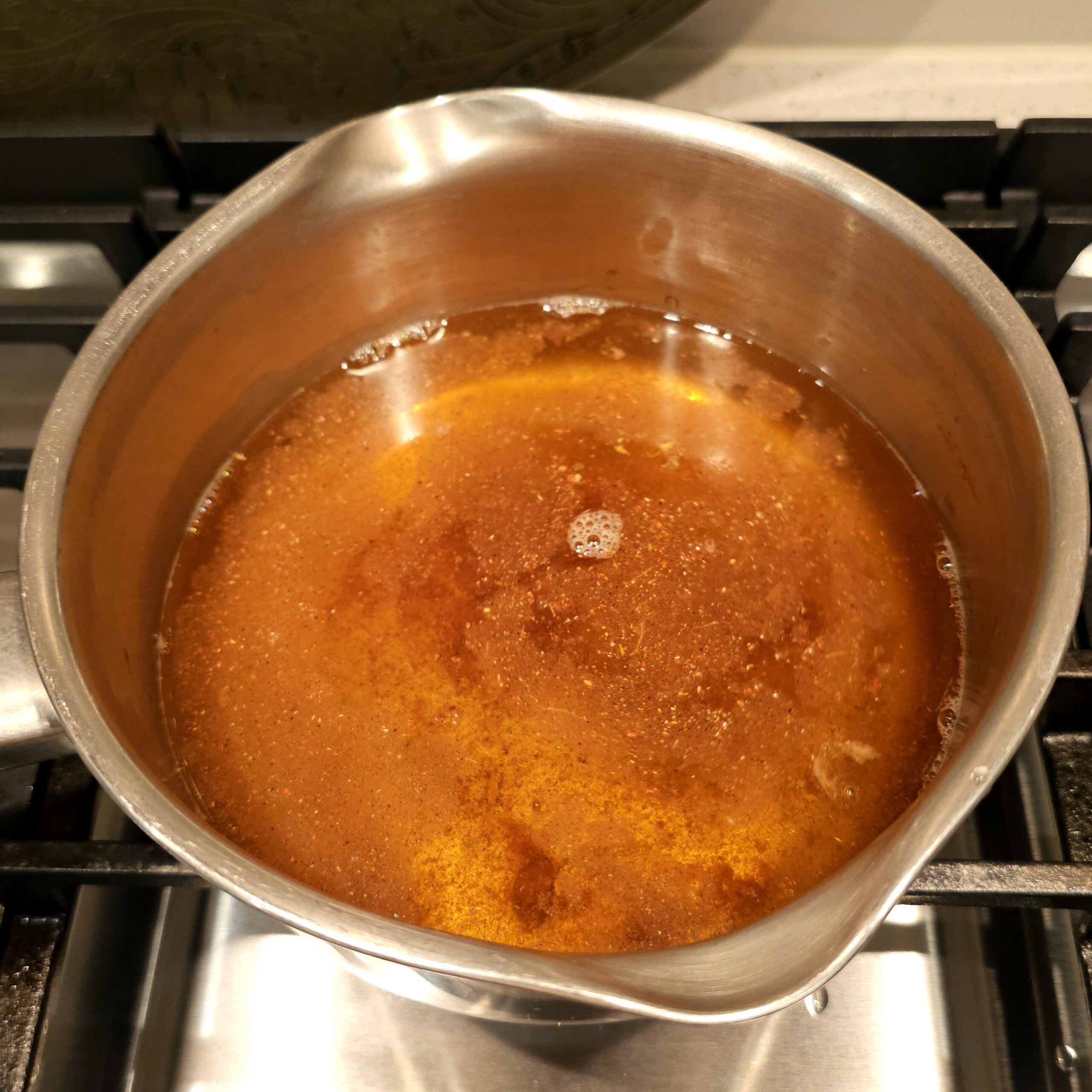 In a medium saucepan over medium heat, add 5 teaspoons of sugar and let it melt and caramelize for about 5 minutes, stirring occasionally. You’re looking for it to just begin turning amber—it’ll smell slightly nutty and sweet.