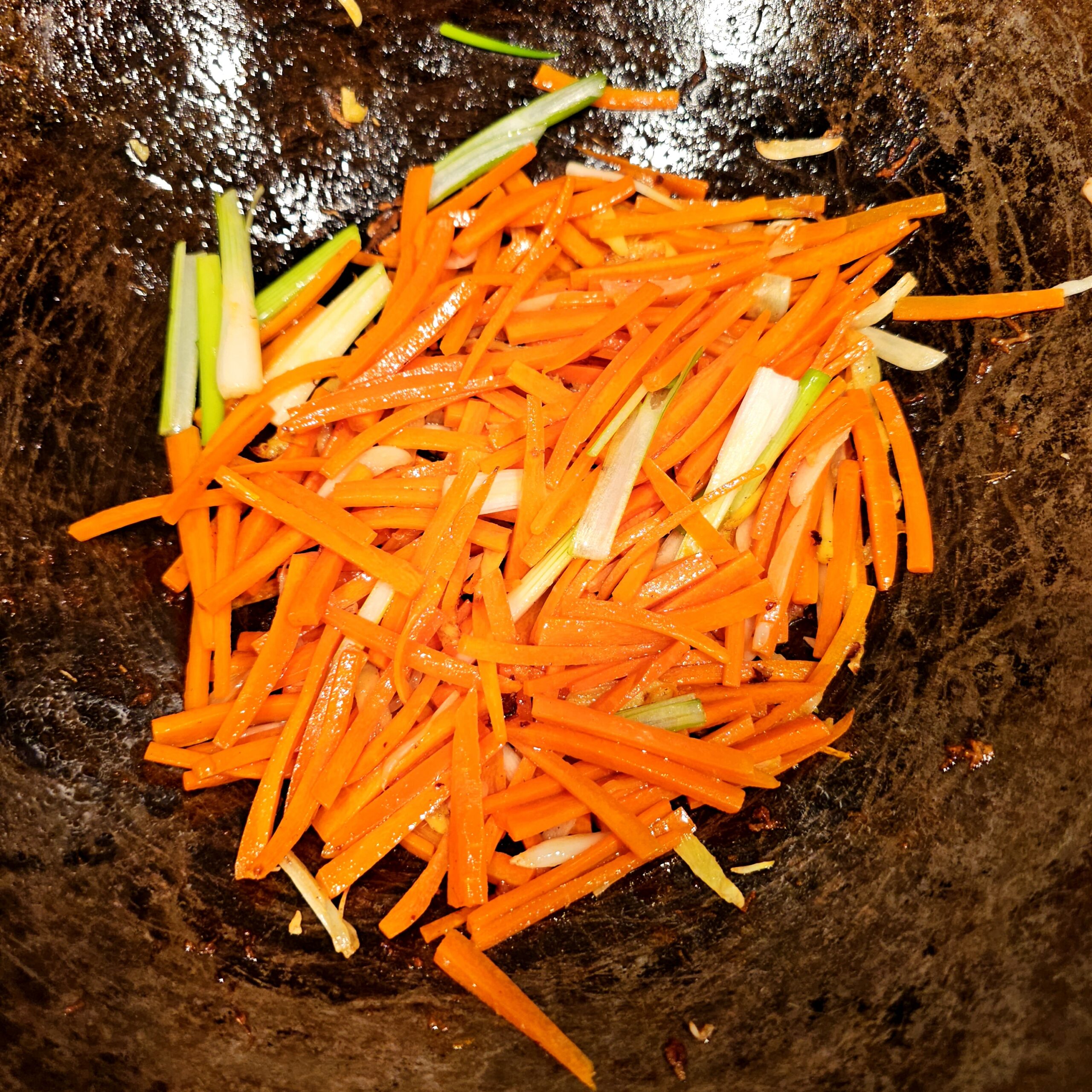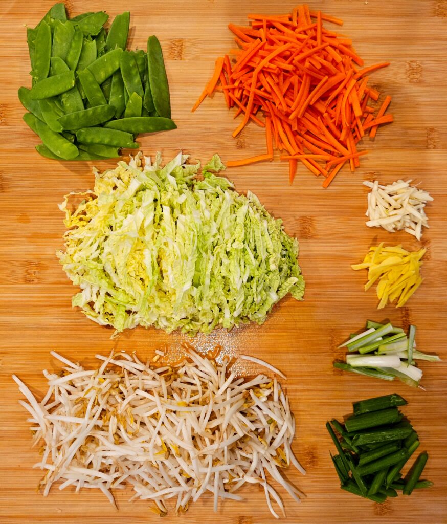 - CARROTS – Julienned for quick cooking and sweetness.