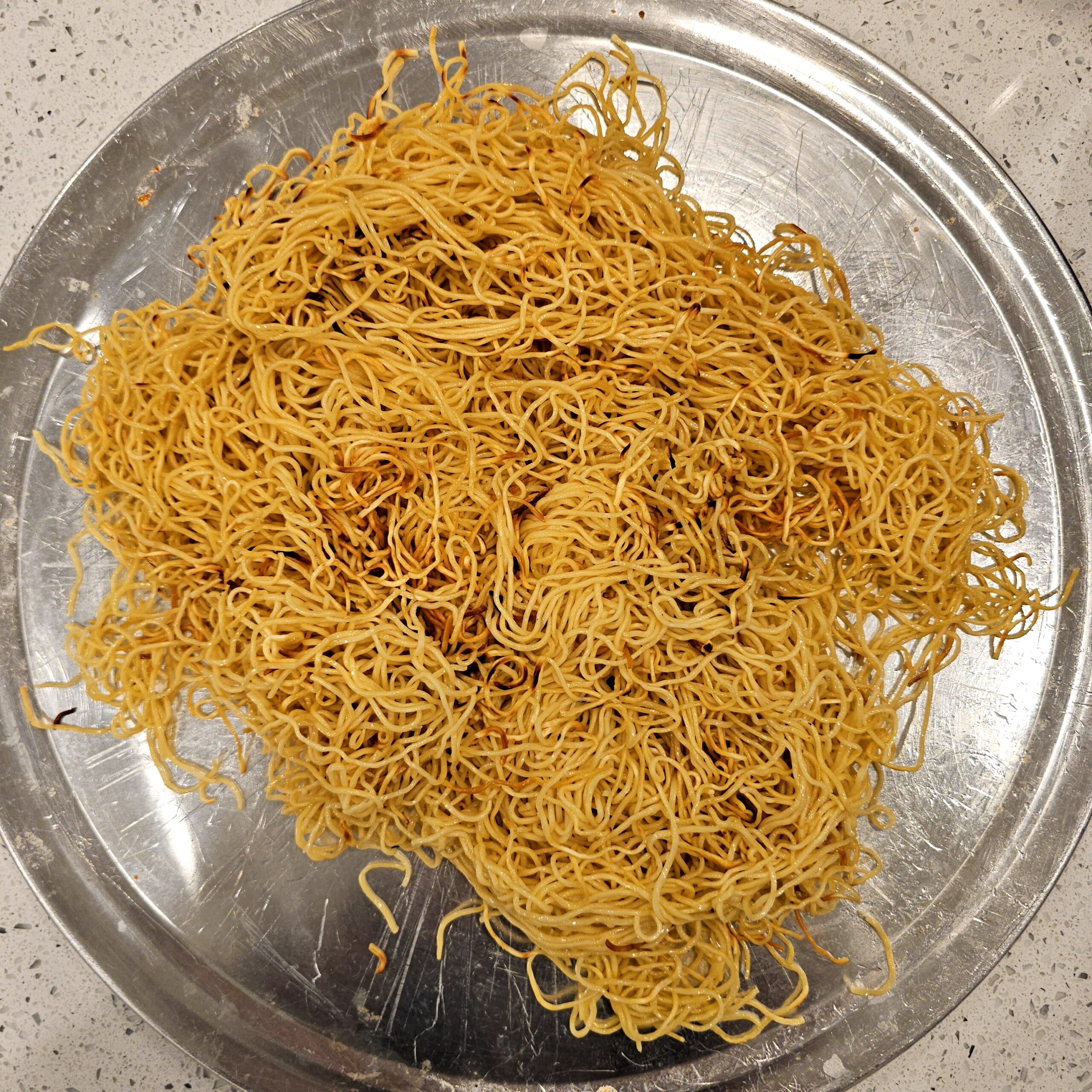Heat 2 tablespoons neutral oil in a large nonstick skillet or wok over medium-high heat. Swirl the oil to coat the surface. Add the dried noodles in a single layer. Let them crisp undisturbed for 2 minutes. Flip the noodles (in sections if needed), add another tablespoon of oil, and fry for another 90 seconds. Flip once more and cook for another 2 minutes, or until golden and lightly crisped throughout. Transfer the noodles back to the baking sheet.