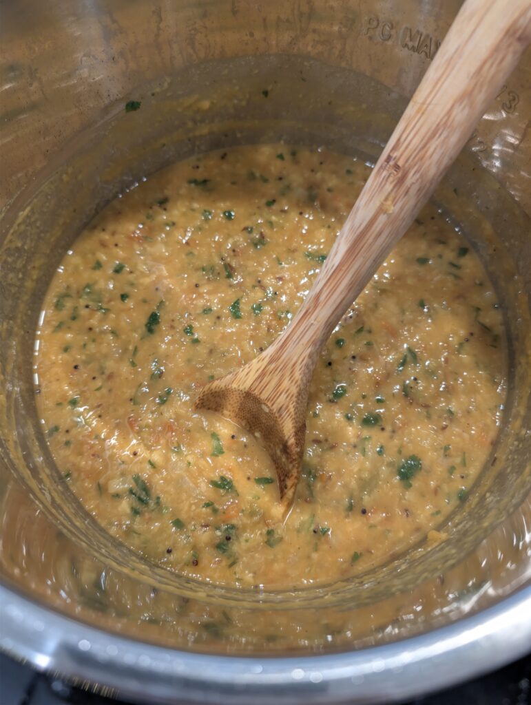 Drain the soaked toor dal and add it to the pot along with 3 cups of water. Stir everything well to ensure nothing is stuck to the bottom, then press the CANCEL button to stop the sauté function. Place the lid securely on the Instant Pot and set the steam release valve to “sealing”. Press the PRESSURE COOK button and set the timer for 10 minutes on high pressure.