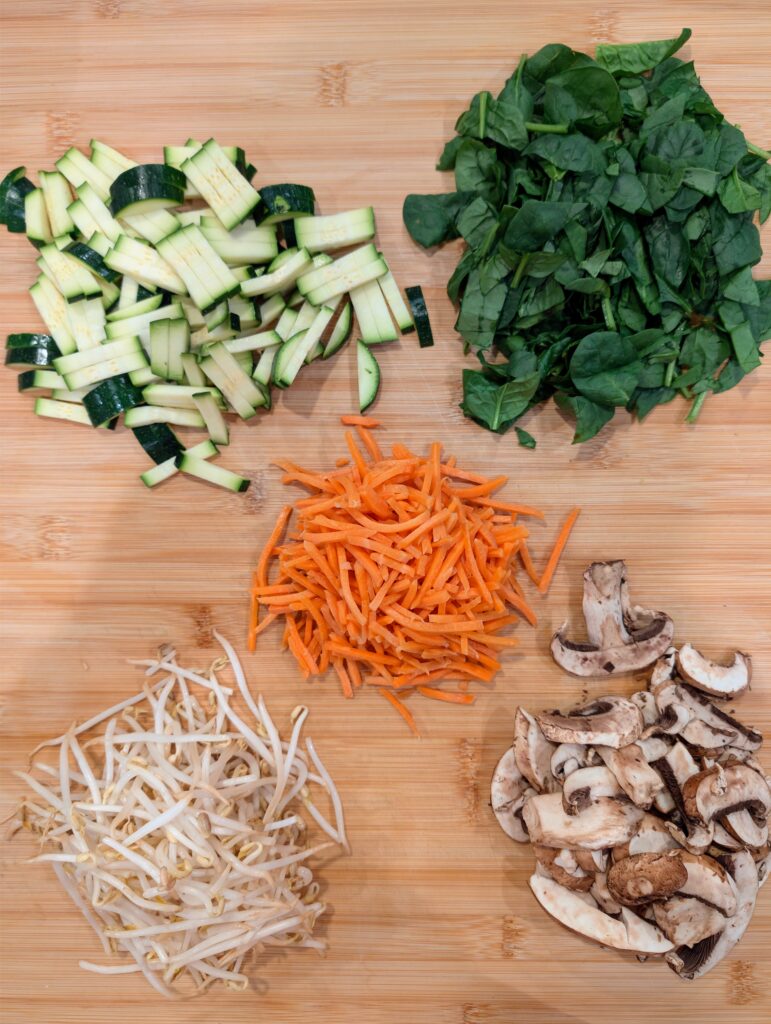 - THE VEGETABLE ARRAY: We focus on a fresh, vibrant mix. This includes sliced zucchini, sliced carrots, sliced mushrooms, roughly chopped spinach, and fresh mung bean sprouts. Each vegetable is cooked quickly to maintain its color and crispness.